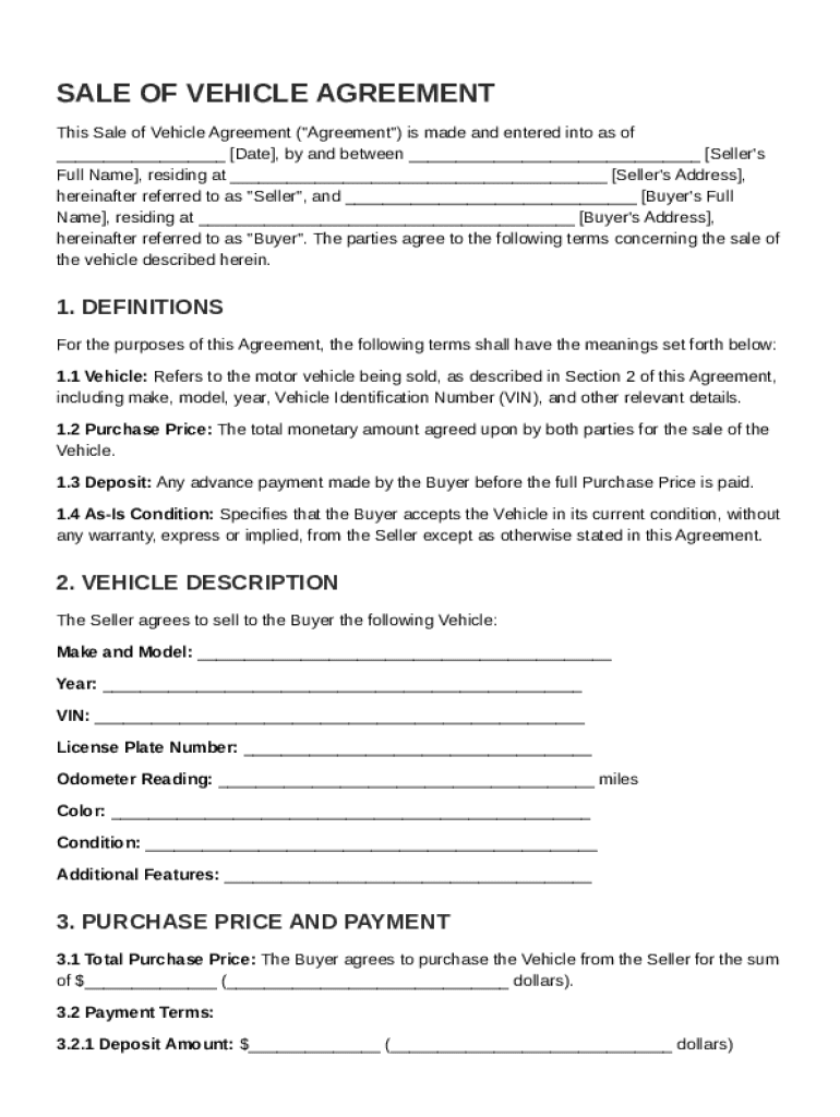 Definition and key provisions of a Sale Of Vehicle Contract Template