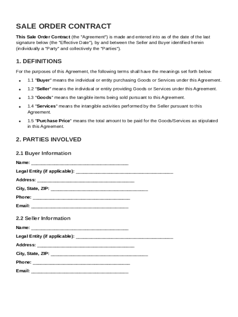 A Sale Order Contract Template is a formal document that outlines the terms and conditions of a sale transaction between a seller and a buyer.