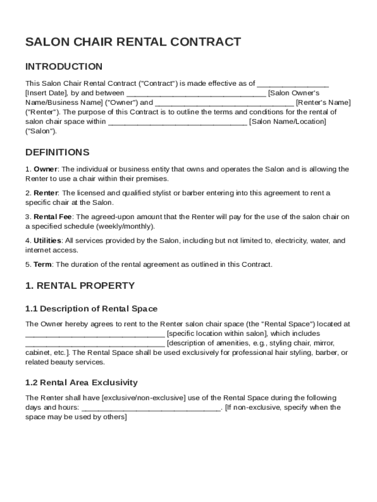 A salon chair rental contract is a legal agreement between a salon owner and a stylist or renter, allowing the renter to use a specific space and its amenities in exchange for a rental fee. This contract outlines key terms such as the rental fee, utilities, and the duration of the rental period. Understanding the importance of having such a contract in the salon industry can help mitigate disputes and establish clear expectations.