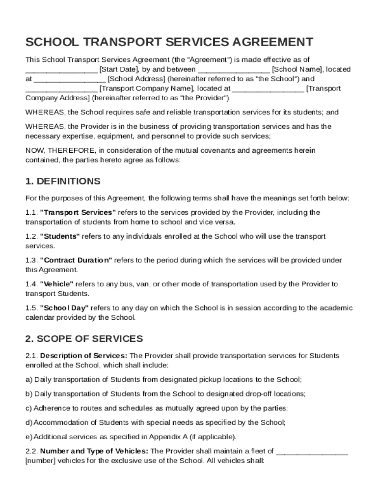 This document outlines the agreement between a school and a transport provider for the safe and reliable transportation of students, including definitions, scope of services, terms, responsibilities,