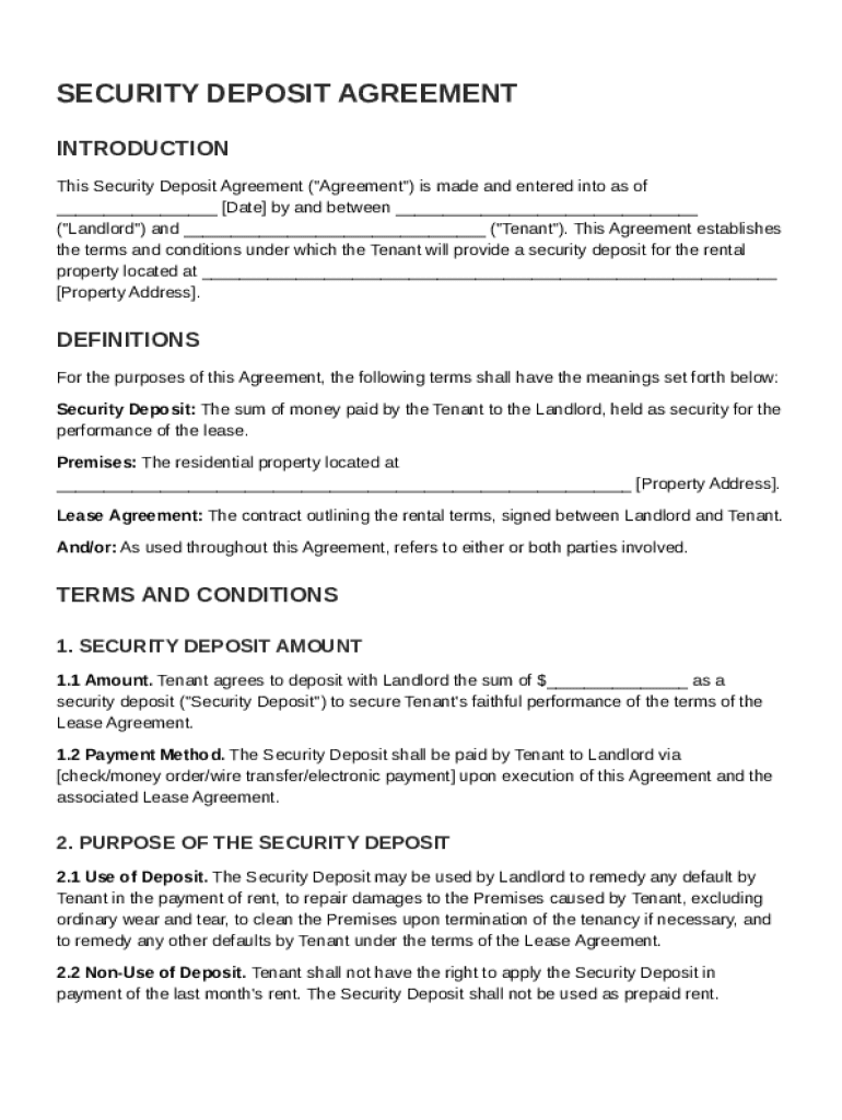 A Security Deposit Agreement is a formal document outlining the terms under which a tenant pays a deposit to a landlord. This deposit serves as a financial safeguard for landlords against potential damages or unpaid rent during a tenant's lease term. The significance of this agreement cannot be overstated, as it establishes trust and responsibility between landlords and tenants.