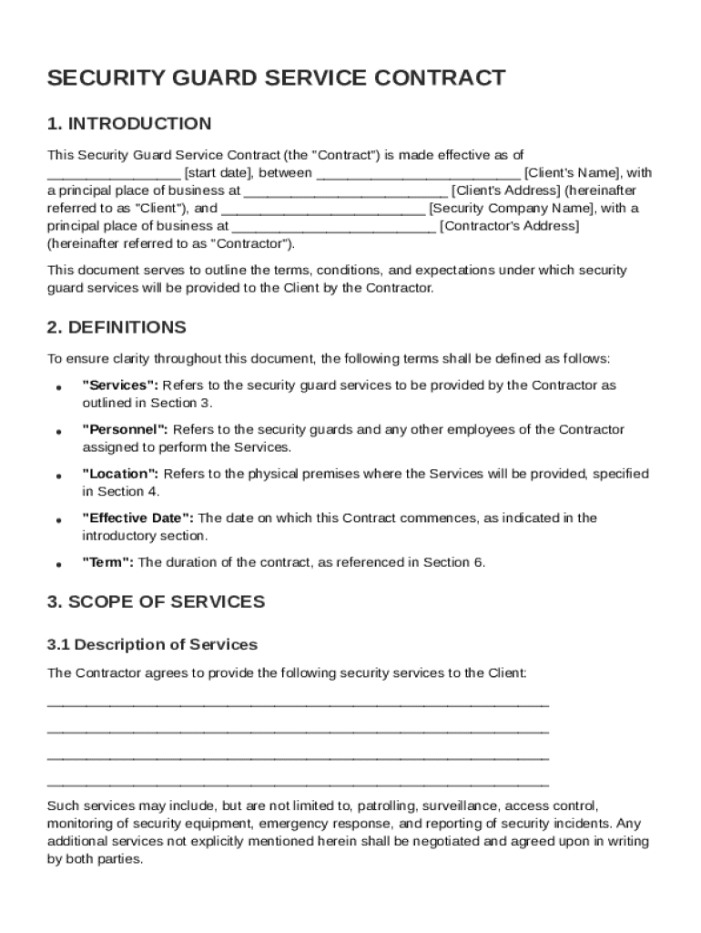 This document outlines the terms, conditions, and expectations for security guard services provided by a contractor to a client, including service scope, compensation, performance evaluation, and