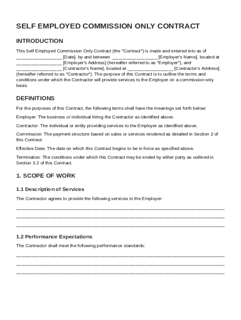 A Self Employed Commission Only Contract is a legal agreement where a contractor is compensated solely based on sales or services delivered, rather than a fixed salary. This type of contract is particularly important for freelancers and self-employed professionals who often rely on variable income streams.