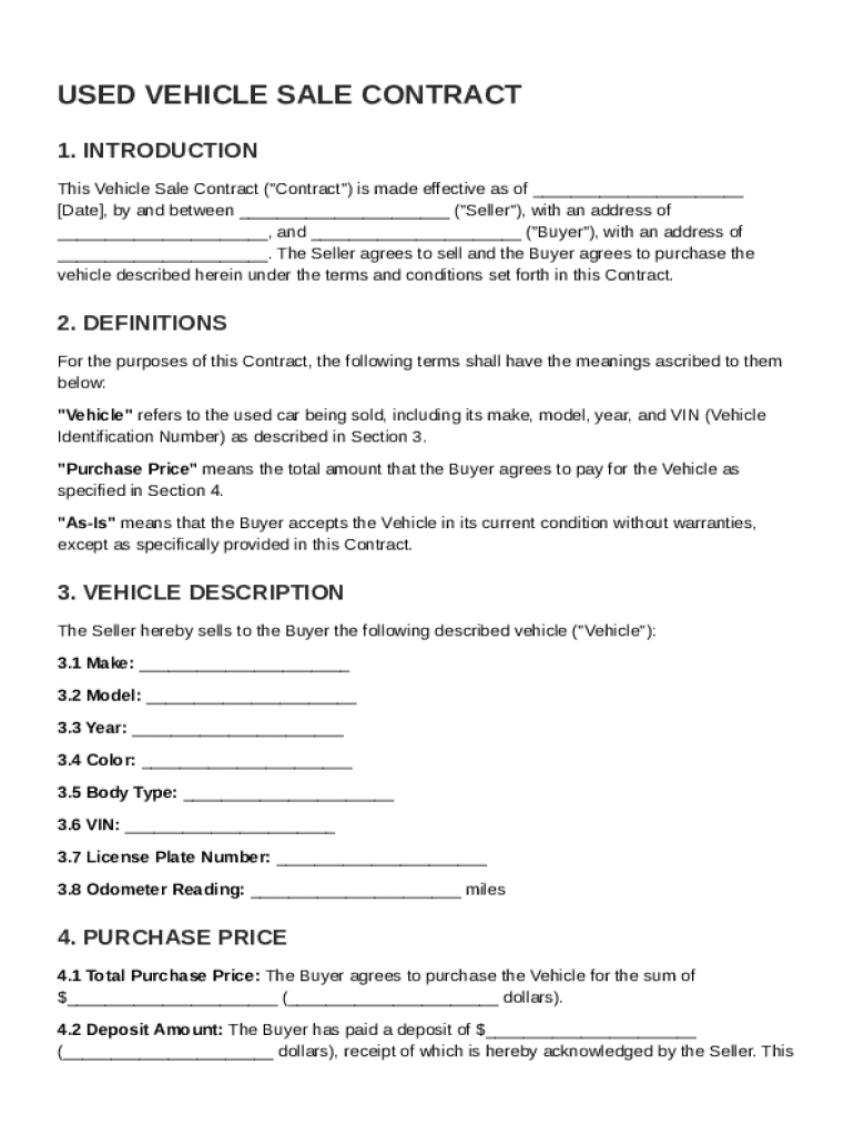 A used car sale contract is a legally binding document that formalizes the sale of a pre-owned vehicle between a seller and a buyer. It serves to protect the rights of both parties and outlines the terms of the sale, including the purchase price and any conditions. Having a written contract is crucial, as it can prevent disputes and misunderstandings later.