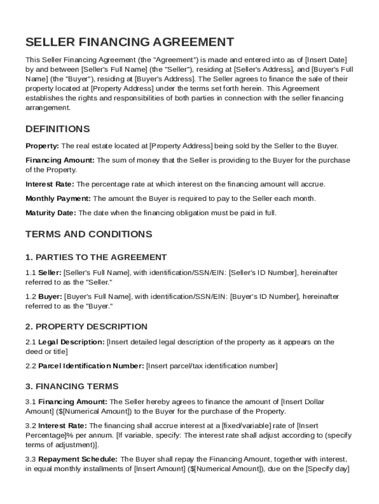 This Agreement outlines the terms and conditions under which the Seller agrees to finance the sale of their property to the Buyer, detailing their rights and responsibilities in the financing arrangement.