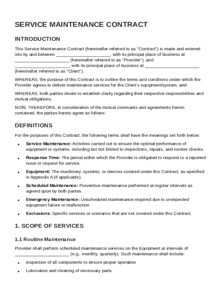 A Service Maintenance Contract is a formal agreement between a service provider and a client, detailing the scope of maintenance services offered. It is crucial for outlining expectations, responsibilities, and liabilities for both parties involved. By having such a contract, clients ensure that necessary services are performed, thereby reducing downtime and unexpected costs.