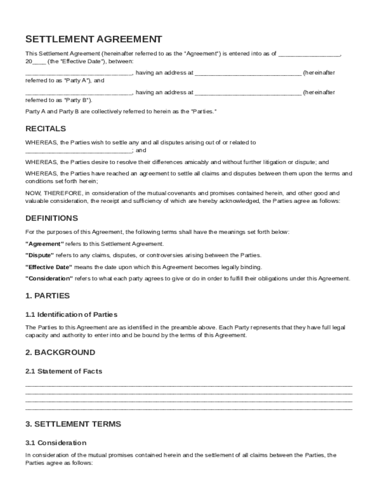 Use this guide to understand the key aspects of a settlement agreement, its components, and how to fill out the template correctly.