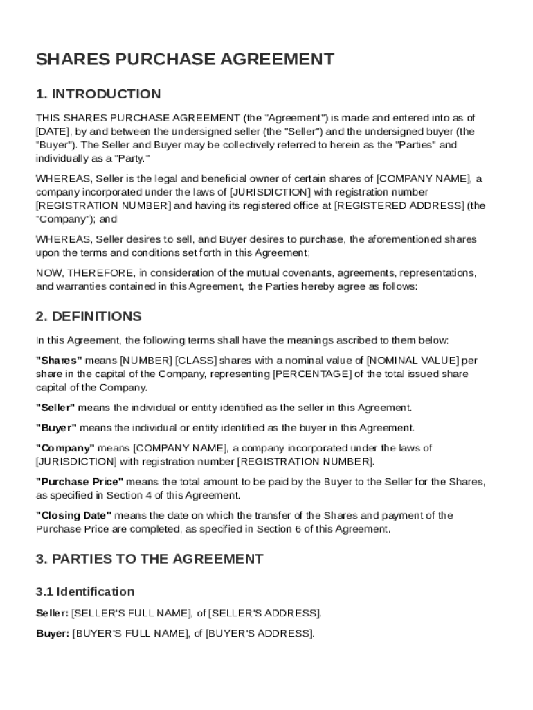 This document outlines the terms and conditions for the sale and purchase of shares between the Seller and Buyer.