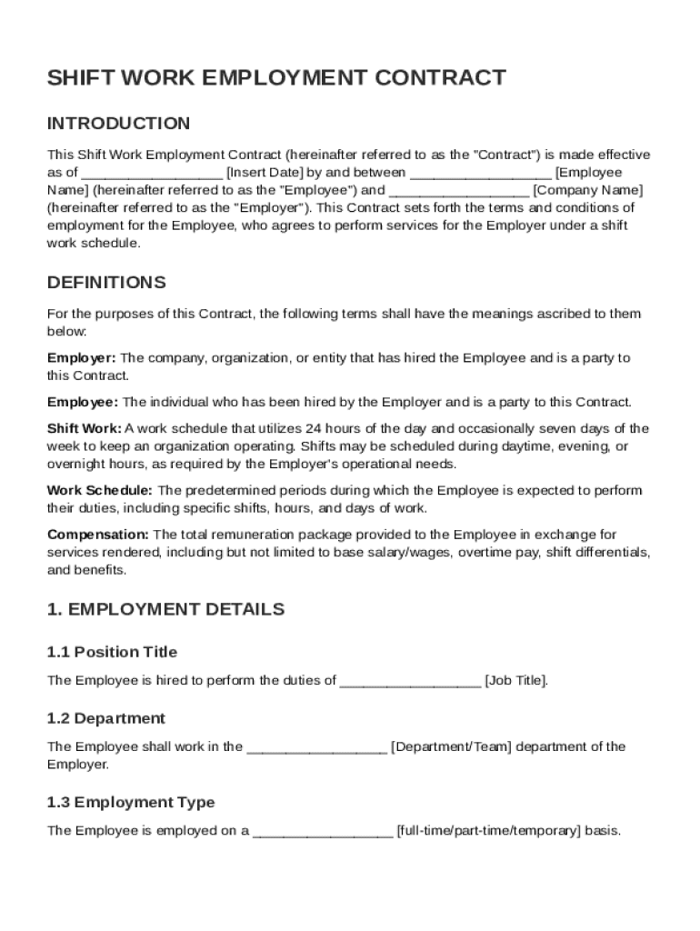Shift Work Employment Contract Template is a document outlining the terms and conditions of employment for individuals working non-standard hours.
