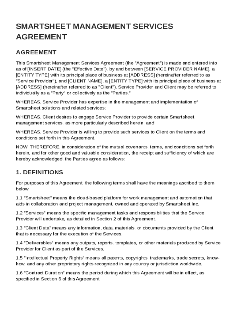 This document is an agreement for management services related to Smartsheet between a service provider and a client, outlining the terms of service, responsibilities, compensation, confidentiality,