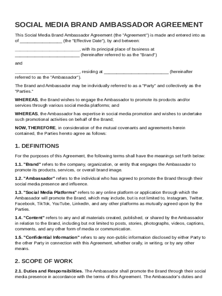 This document is an agreement between a Brand and an Ambassador outlining the terms under which the Ambassador will promote the Brand\'s products and services through various social media platforms.