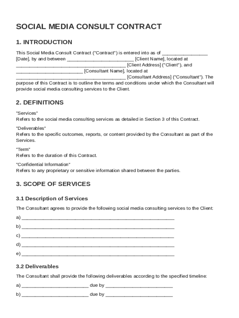 The Social Media Consult Contract Template is a legally binding document that outlines the terms of service between a social media consultant and their client.