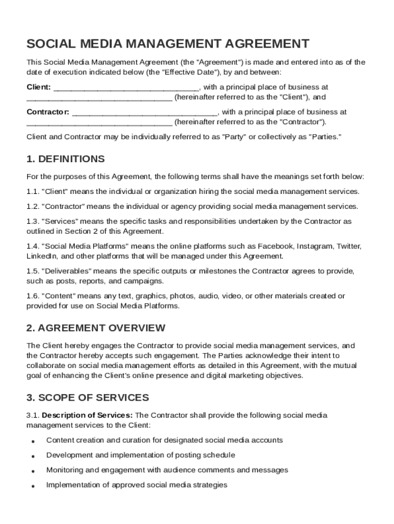 Understanding the fundamental provisions of a Social Media Management Contract Template is essential for both parties. Key provisions include: