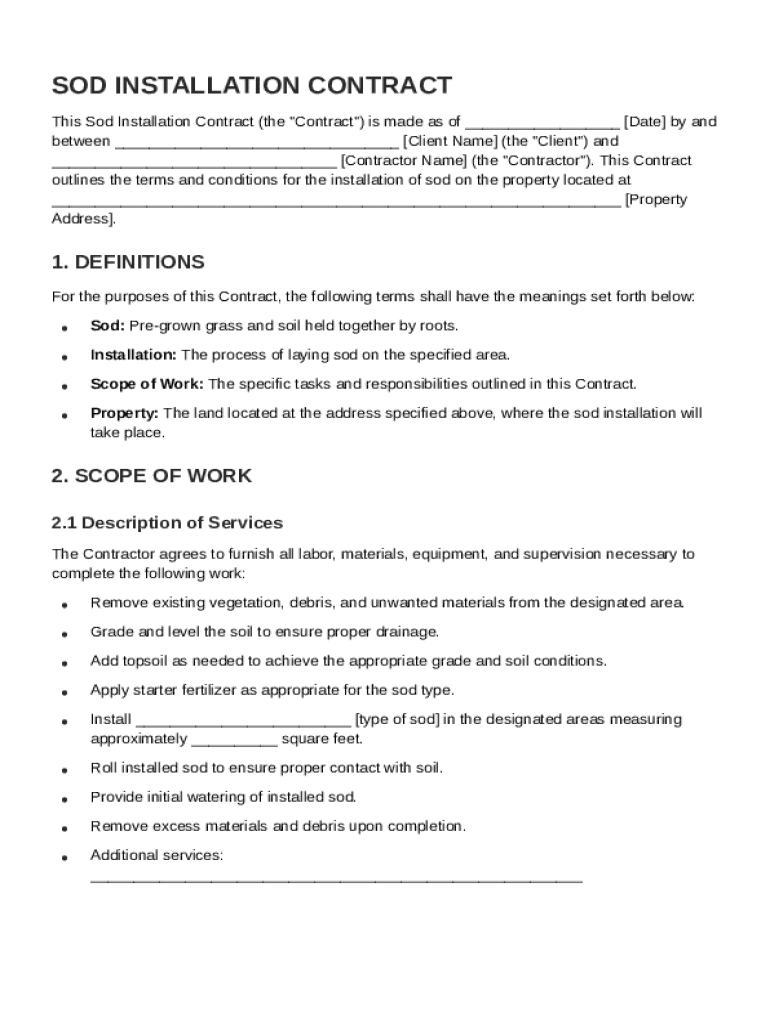 A Sod Installation Contract Template is a legal document outlining the terms and conditions for the installation of sod between a client and a contractor.