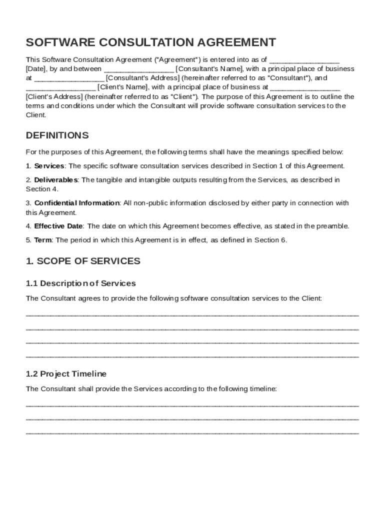 When drafting a software consultation agreement, it’s essential to include specific components to ensure all necessary elements are covered. These components not only clarify the roles and responsibilities but also set expectations for both parties involved.