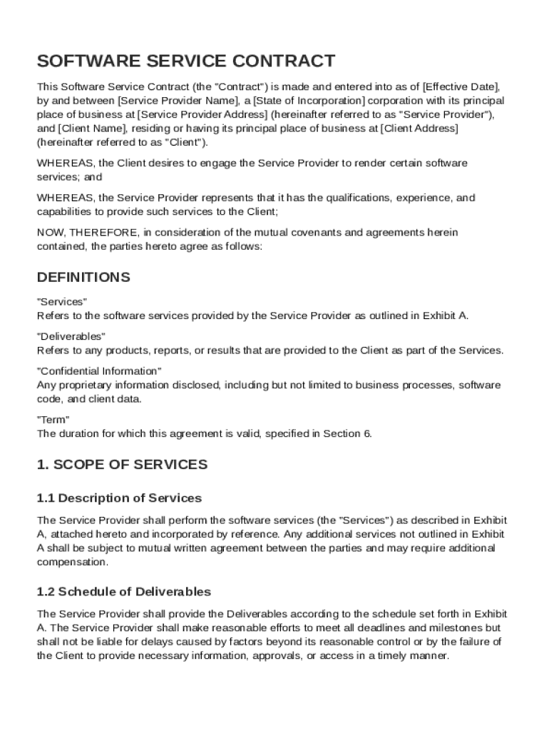 A comprehensive Software Service Contract includes various core components that outline the agreed-upon terms.