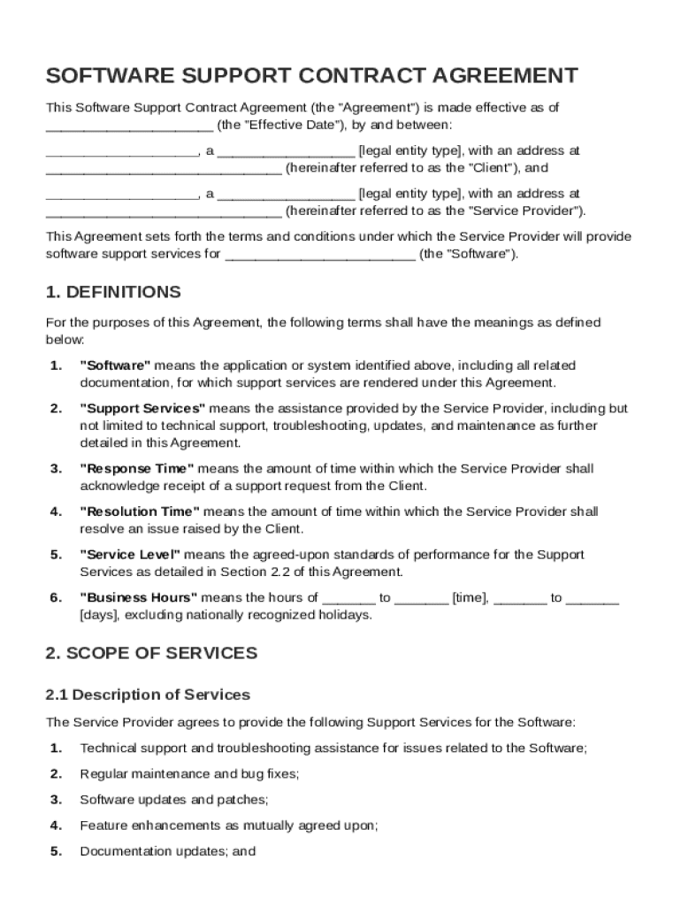 A Software Support Contract is a legal agreement between a service provider and a client that outlines the terms of support services. This includes responsibilities, response times, and scope of services related to software upkeep.