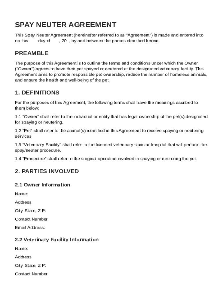 A well-constructed Spay Neuter Contract Template defines the obligations of the pet owner in ensuring the spaying or neutering of their pet. It typically includes: