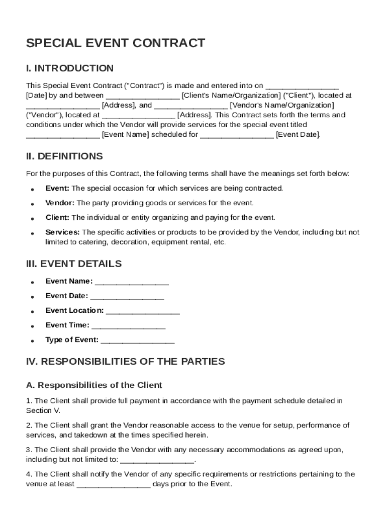 Understanding the components of a special event contract is vital. Typical sections include the introduction, definitions, and event details, which provide a comprehensive overview of the agreement.