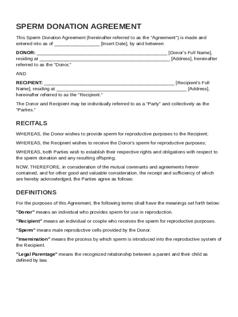 A Sperm Donation Contract Template is a legal document that outlines the terms and conditions between a sperm donor and a recipient regarding the donation of sperm.