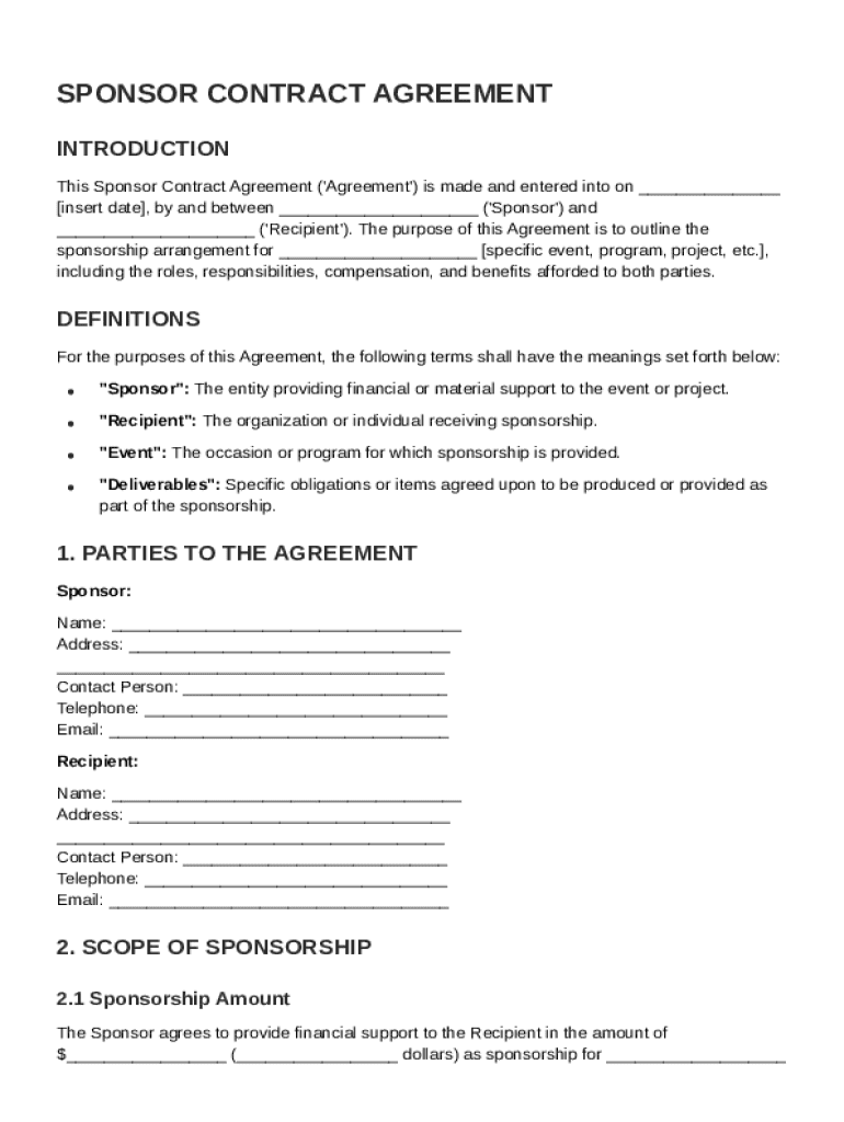 A comprehensive sponsor contract generally includes several key sections that clarify the agreement's scope. These sections are critical for providing structured guidance for both parties involved.