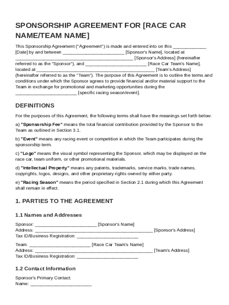 The Sponsorship Race Car Sponsorship Contract Template is a legal document designed to outline the terms of sponsorship agreements between race car drivers and sponsors.