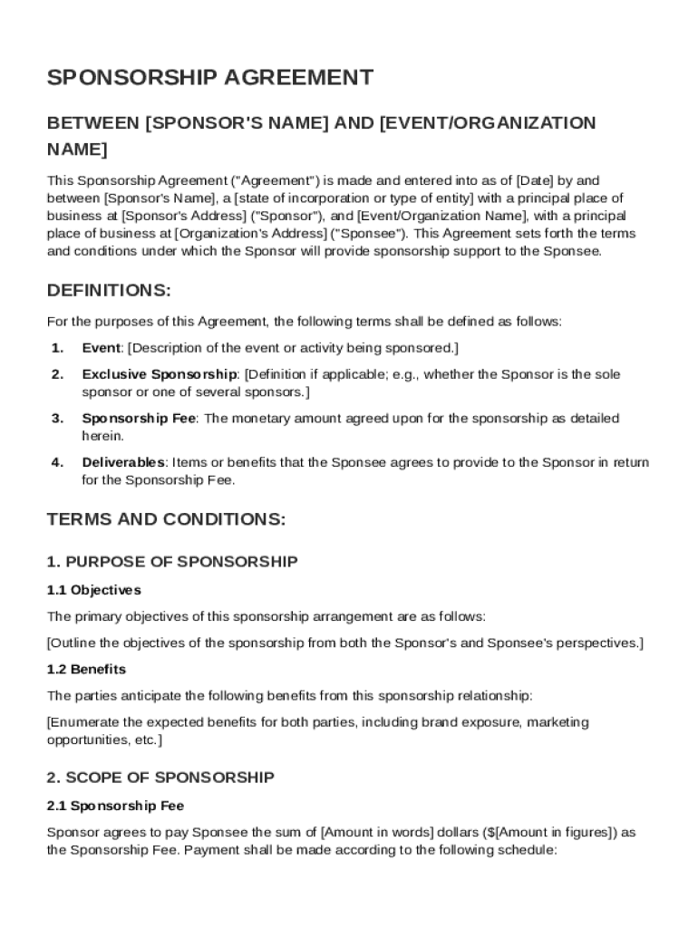 A sponsorship agreement is a formal contract between a sponsor and an event organizer, which defines the expectations, rights, and responsibilities of both parties. Having a concrete agreement is crucial as it mitigates misunderstandings, establishes deliverables, and clarifies various terms. Common components include the event details, sponsor obligations, and compensation specifics.