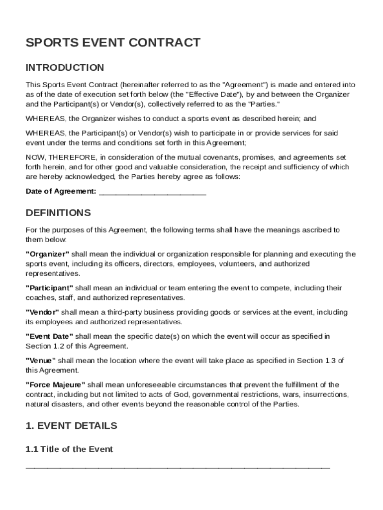 A sports event contract is a legally binding agreement that outlines the responsibilities and expectations of all parties involved in a sporting event. It serves as a critical document for event organizers, participants, and vendors, ensuring clarity and accountability.