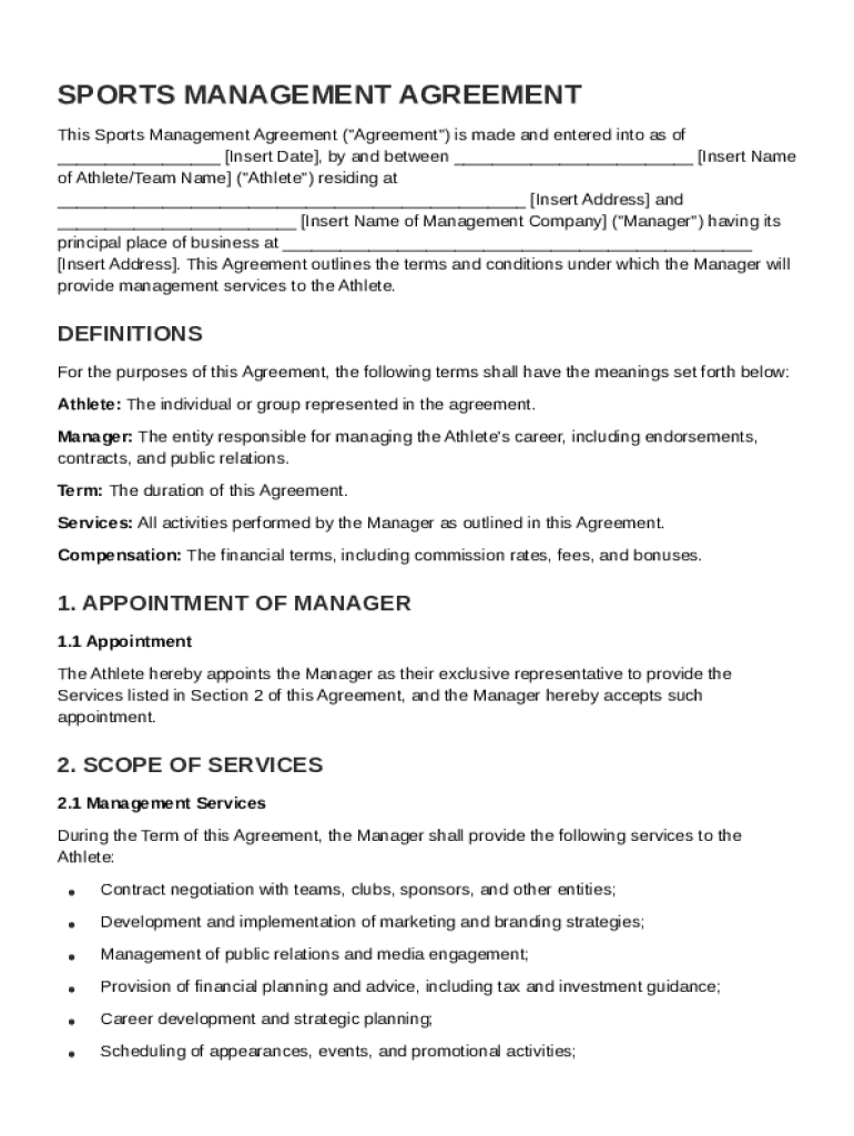 This document outlines the terms and conditions under which a Manager provides management services to an Athlete or a team, detailing appointment, scope of services, compensation, term, confidentiality,