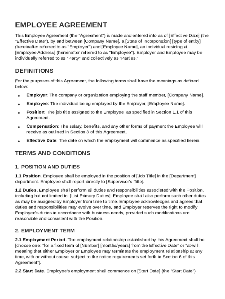 An employee agreement, or employment contract, is a legally binding document that outlines the relationship between the employer and the employee. It includes key terms that define the roles and expectations for both parties.