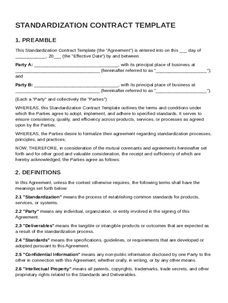 This document serves as a template for a Standardization Contract Agreement, outlining the terms, conditions, and responsibilities of the involved parties regarding the adoption and implementation