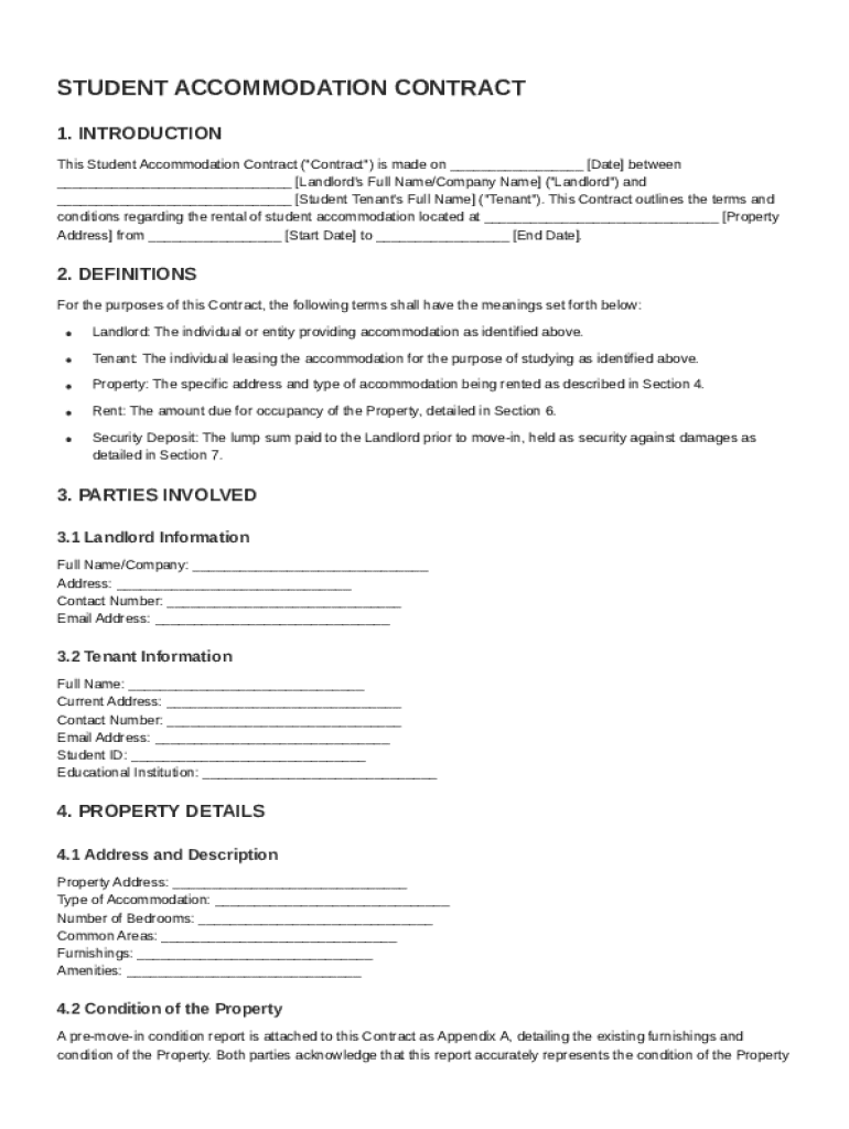 This contract outlines the terms and conditions regarding the rental of student accommodation between the landlord and tenant, including definitions, parties involved, property details, lease terms,
