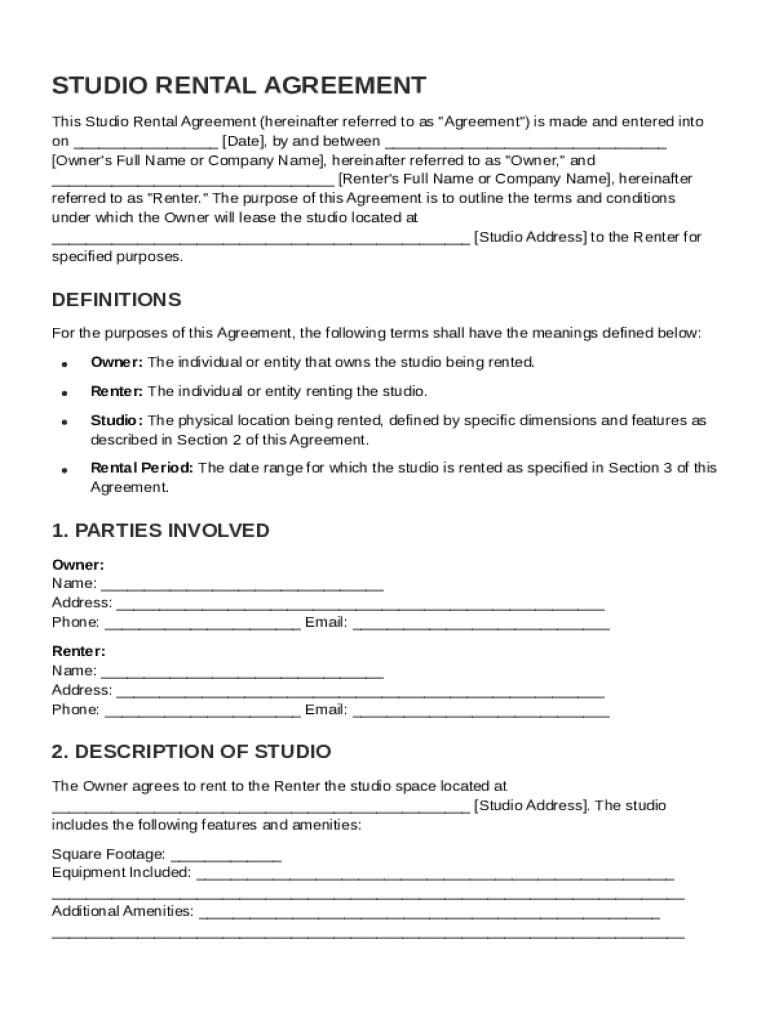 The rental agreement should clearly identify the studio owner and the renter, including their contact information.