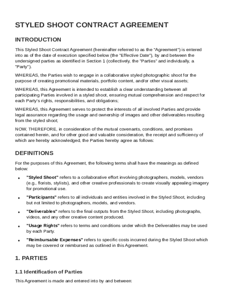 Understanding key terms is essential when dealing with a Styled Shoot Contract. This clarity helps all participants to align their expectations, responsibilities, and rights.
