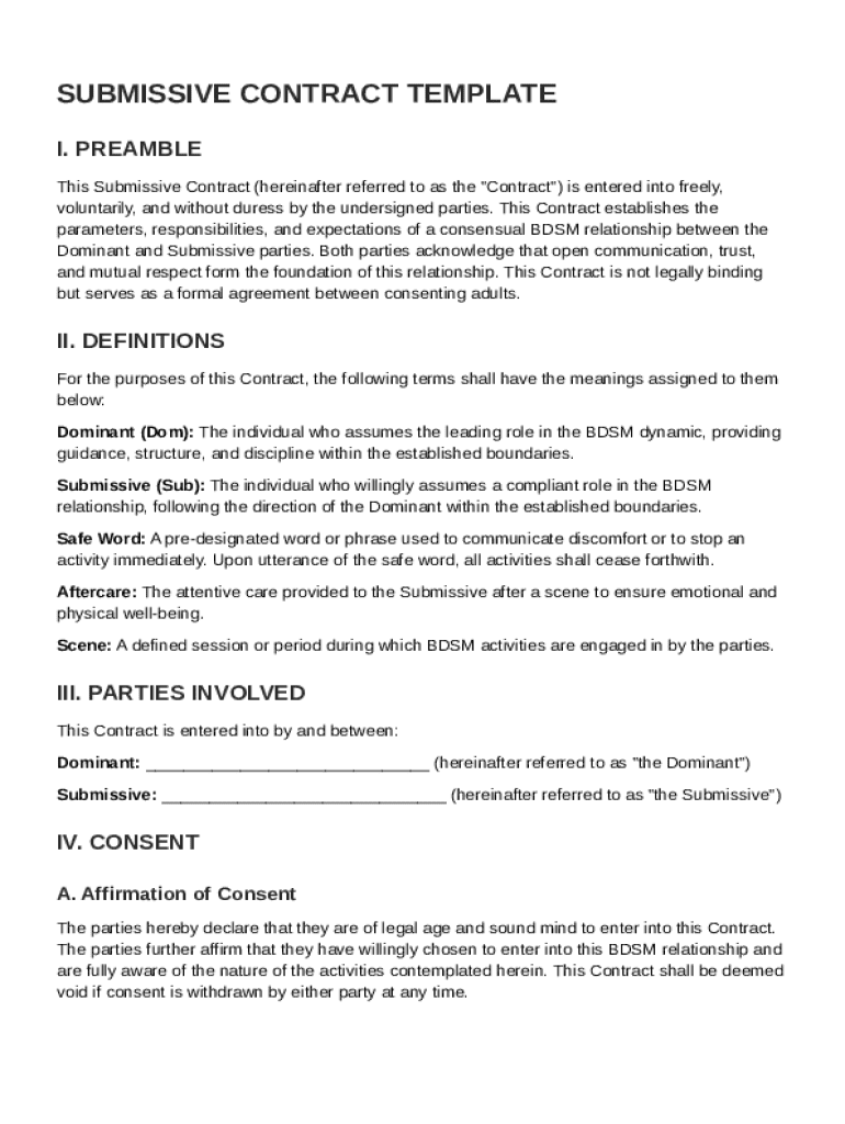 A Submissive Contract Template is a formal document outlining the expectations, boundaries, and responsibilities of a submissive and dominant in a BDSM relationship.