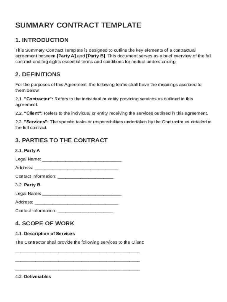 A Summary Contract Template is a concise document outlining the key terms and agreements between parties involved in a transaction or service.