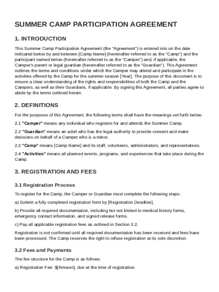 A Summer Camp Contract Template is a legal document that outlines the terms and conditions of participation in a summer camp program.