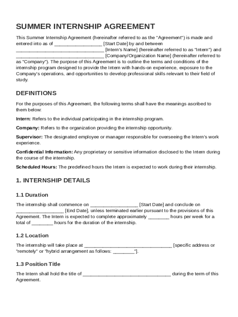 A Summer Internship Contract Template is a formal agreement outlining the terms and conditions of a summer internship between an intern and a company.