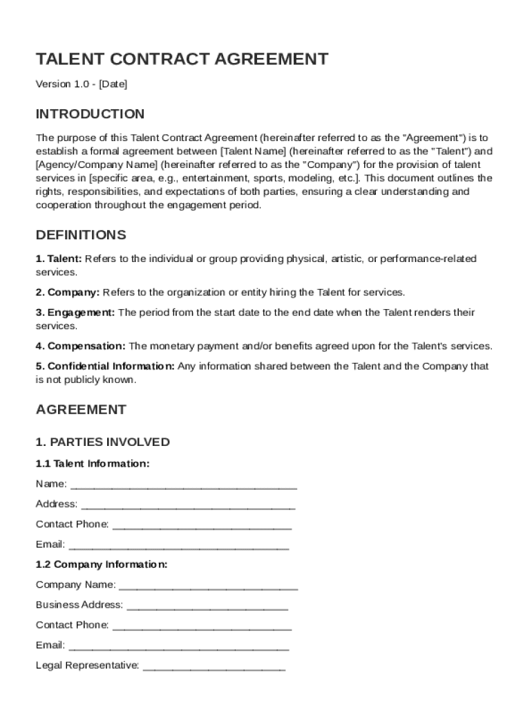 A Talent Contract Agreement is a legal document that outlines the terms and conditions between a talent and a company. This document serves to define roles, expectations, and obligations of each party, ensuring clarity in rights and responsibilities. A well-structured agreement protects both parties and facilitates a smooth working relationship.