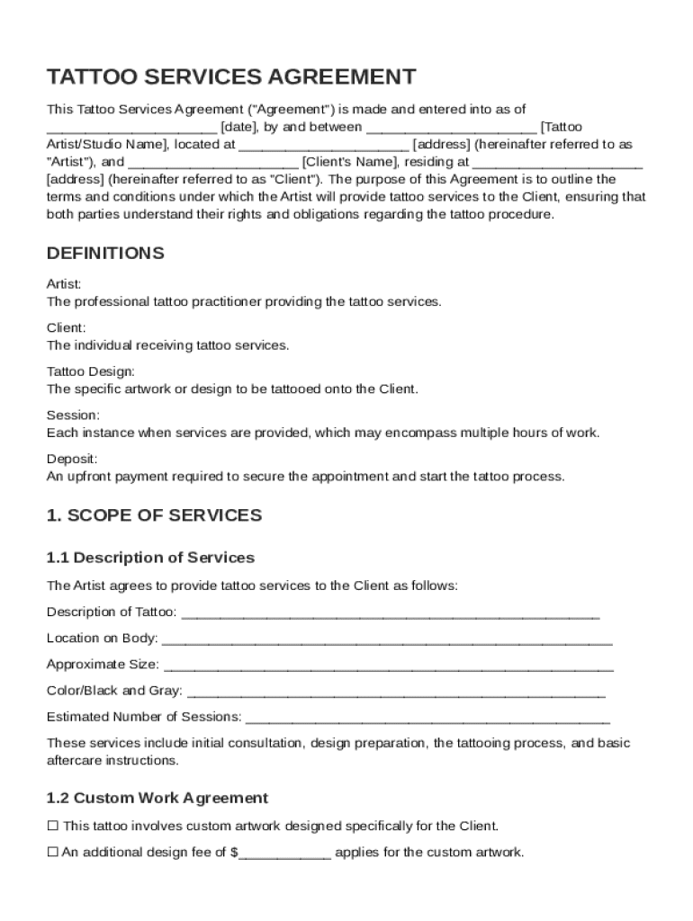 This agreement outlines the terms and conditions under which a tattoo artist will provide tattoo services to a client, including services, payment terms, health disclosures, scheduling, aftercare,