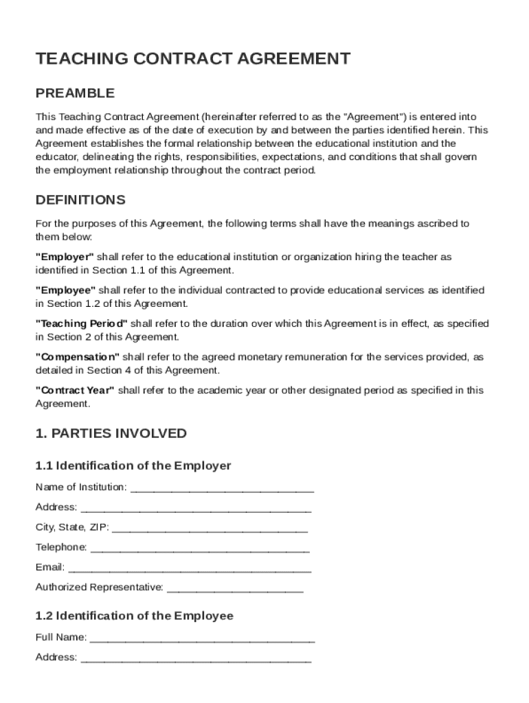 A Teaching Contract Agreement is a formal document that establishes the relationship between an educator and the institution. It outlines the rights and responsibilities of both parties, ensuring clear communication and expectations. The importance of a formal agreement cannot be understated, as it serves to protect both the teacher and the school, preventing disputes that may arise.