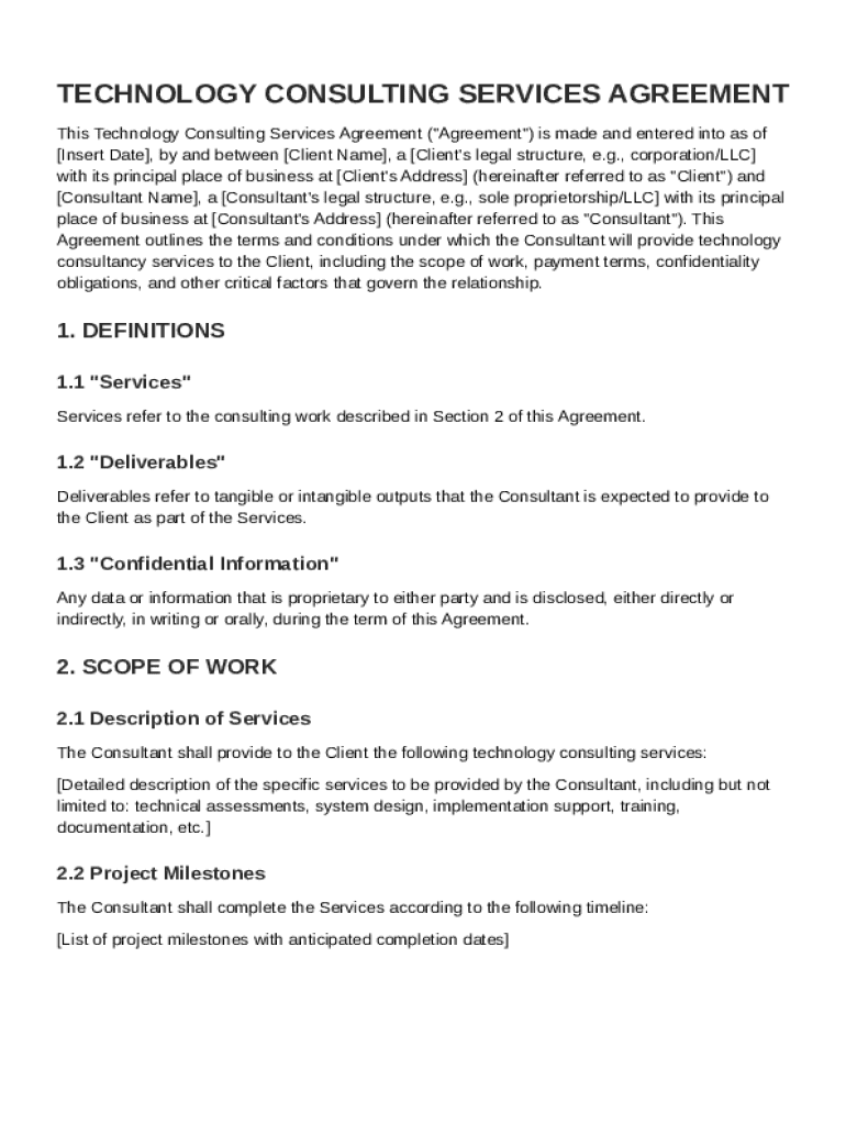 A well-crafted Technology Consulting Services Agreement typically contains several key components that are essential for clarity and effectiveness.