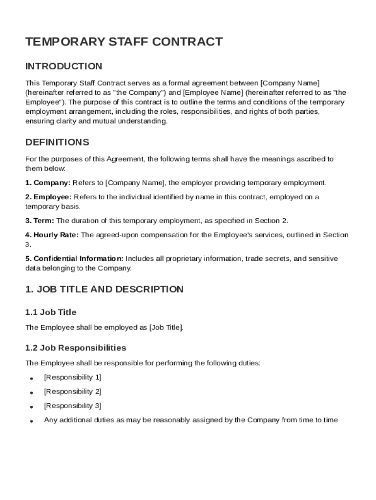 This Temporary Staff Contract outlines the terms and conditions of temporary employment between the Company and the Employee, including job title, responsibilities, compensation, work schedule, and