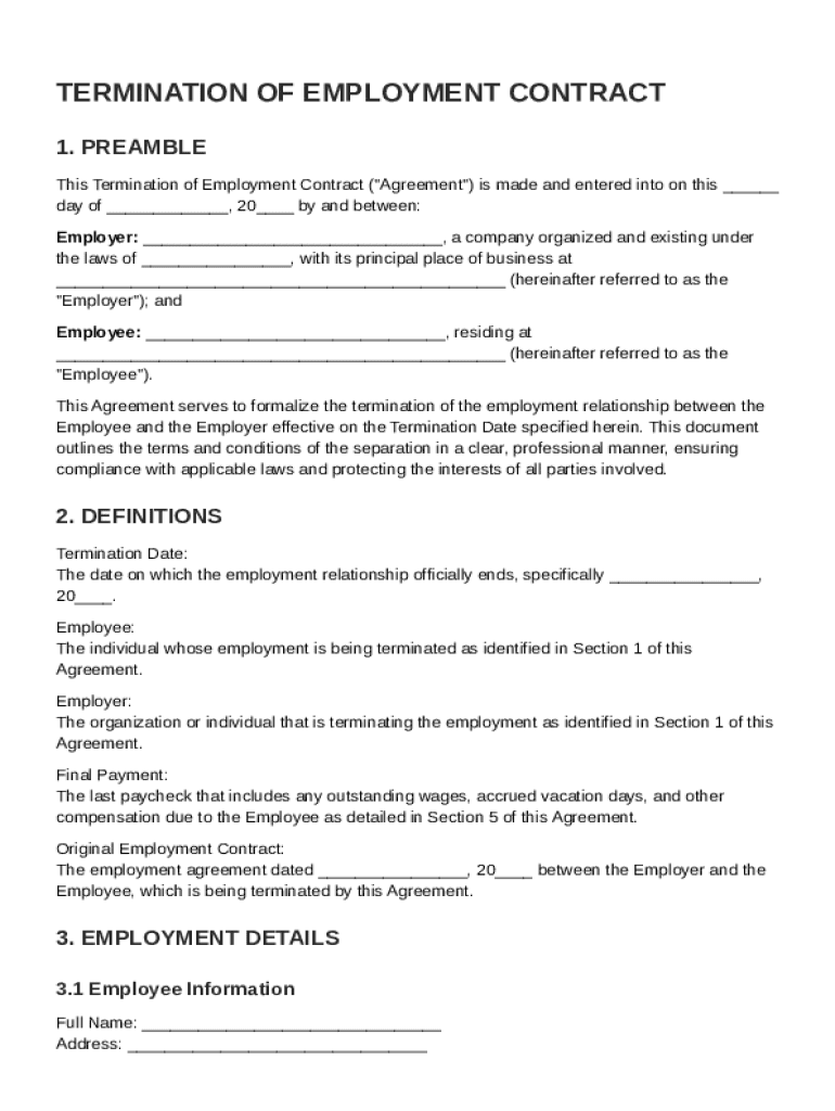 Defines essential terms like 'Termination Date' and 'Employee,' which are vital for understanding the document.