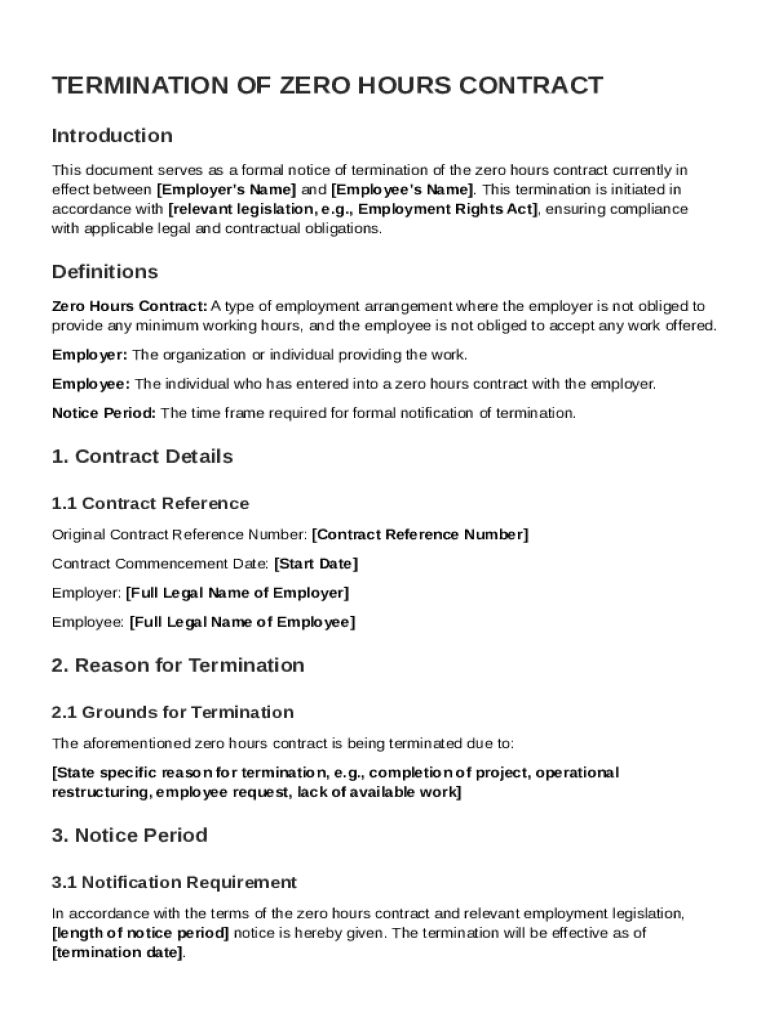 A Termination Of Zero Hours Contract Template is a legal document used to formally terminate a zero hours employment agreement between an employer and an employee.