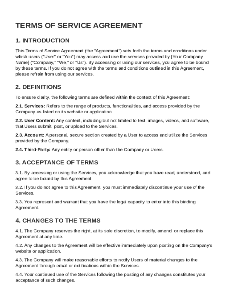 This document outlines the terms and conditions under which users may access and use the services provided by the Company, including definitions, acceptance of terms, user responsibilities, and legal