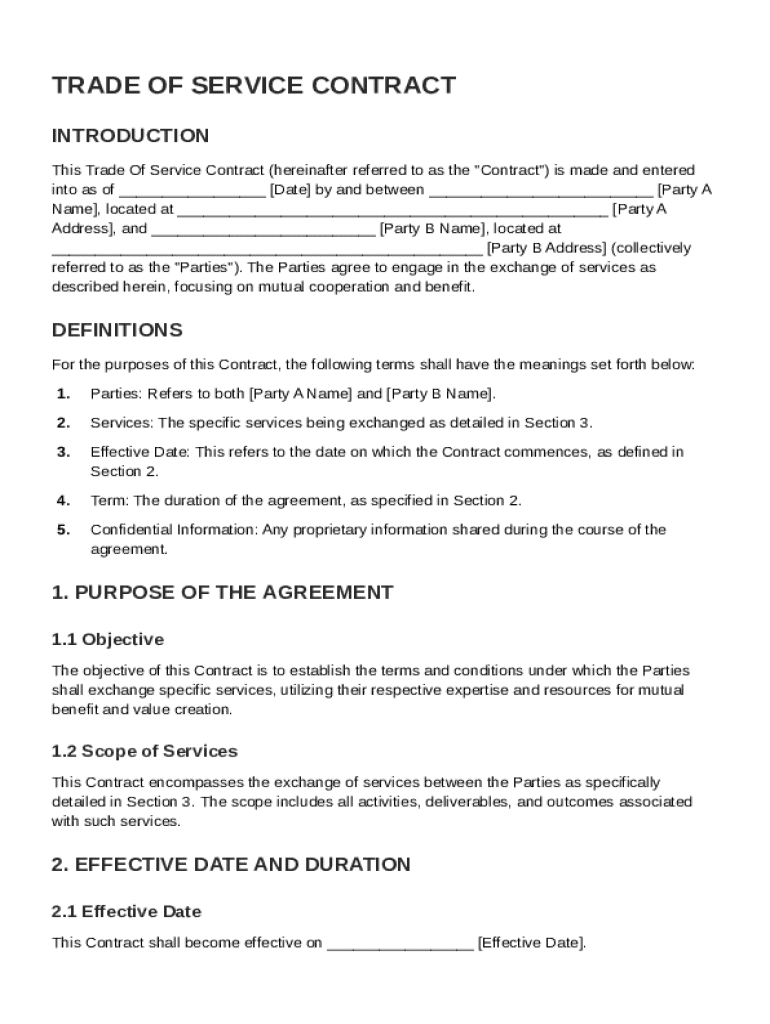 A Trade Of Service Contract is a legally binding document that outlines the terms and conditions under which services are exchanged between two parties. Such contracts help ensure clarity regarding expectations and responsibilities. Understanding the key components and importance of these agreements is essential for effective service management.