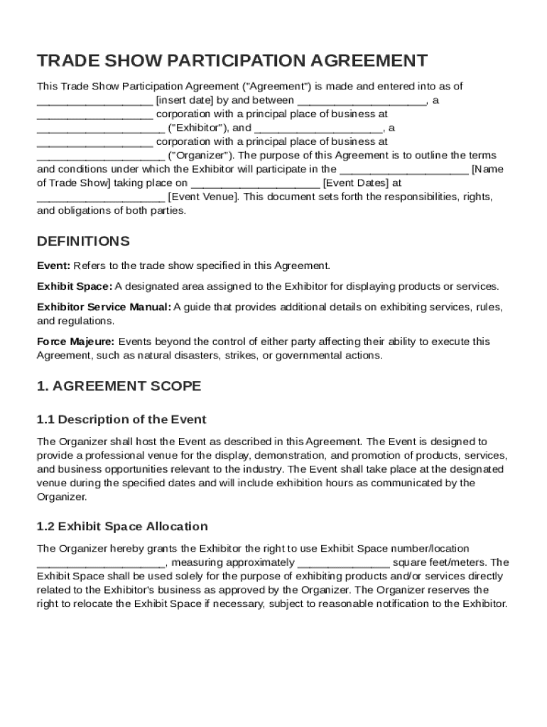 A Trade Show Participation Agreement is a formal contract between an exhibitor and an event organizer. It outlines the rights, responsibilities, and expectations of both parties, ensuring clarity and protection. Having a well-defined agreement is crucial for preventing misunderstandings and establishing a professional relationship.