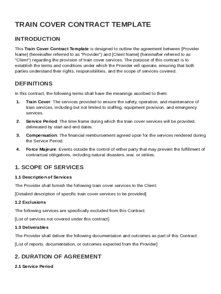 This template outlines the agreement between a service provider and a client for train cover services, detailing the terms, responsibilities, compensation, and other legal considerations.