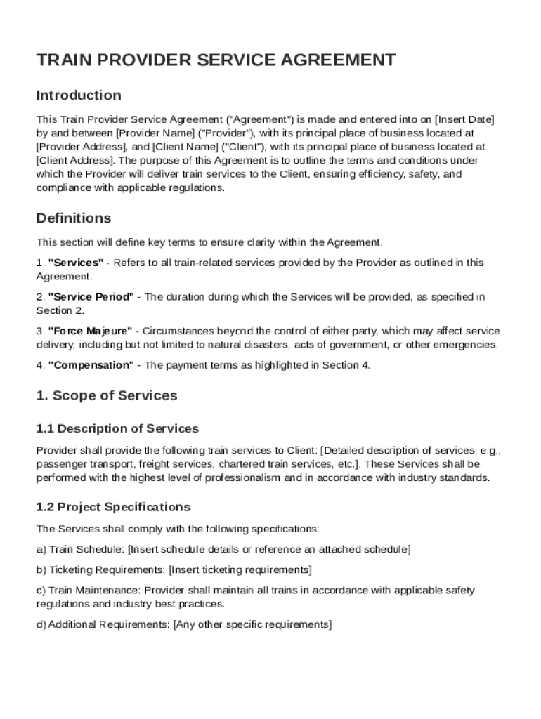 A comprehensive train provider contract includes essential clauses such as Services, Compensation, and Force Majeure. Each component must be carefully articulated to avoid misunderstandings and ensure all legal obligations are met.